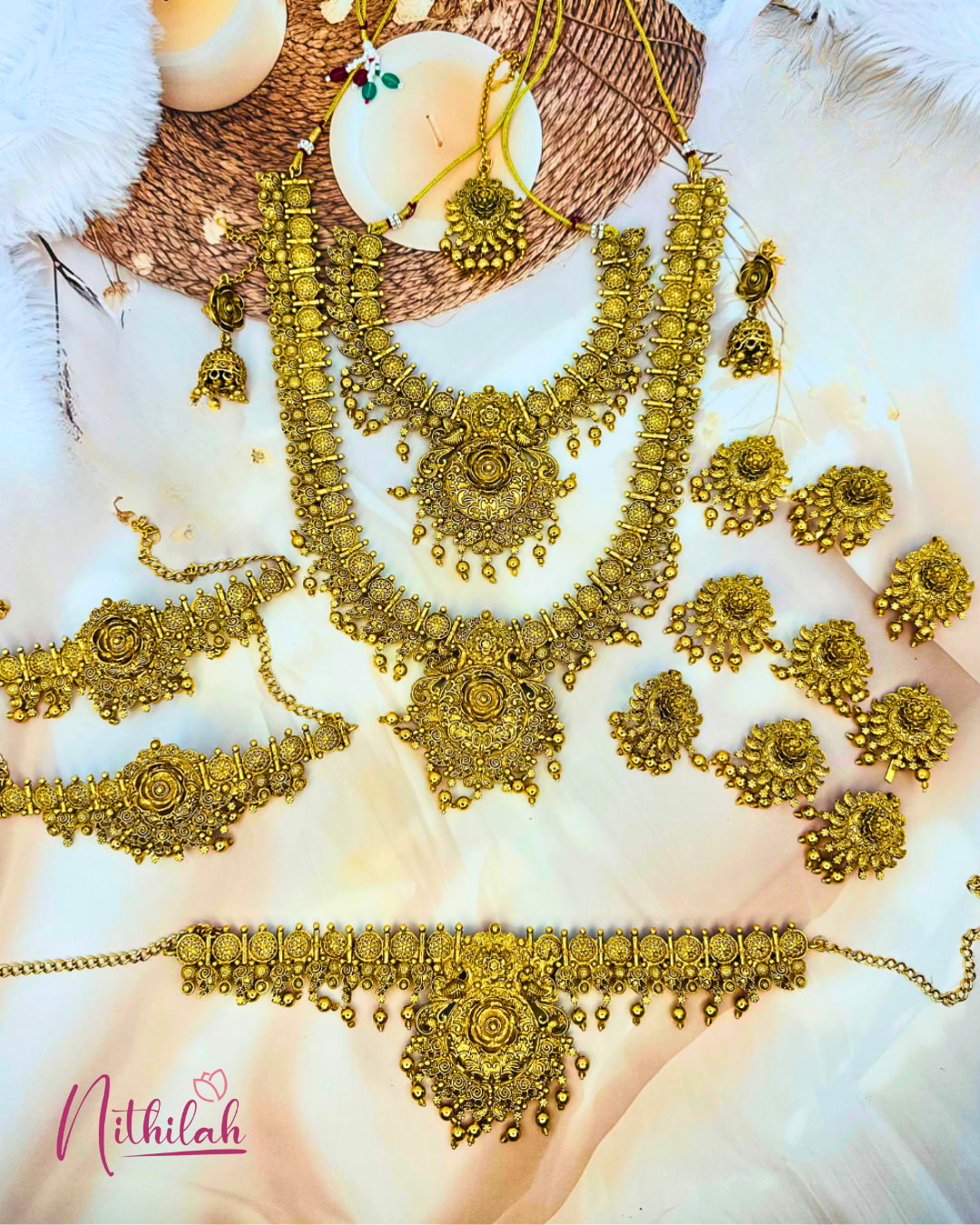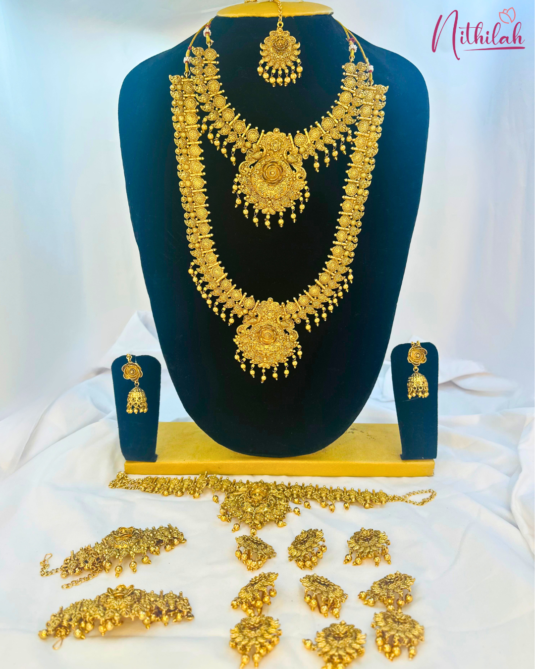 Details & Specifications:Material Used: Copper with brass with Gold toned Pearls Weight: Haaram –199gms, Necklace- 105gms,Earring - 28 gms, Maangtikka– 14gms, Hip belt – 119gms, Jade– 119gms, Vanki – 119gmsLength:Haram - 29Cms. Necklace – 15cms, Earring– 5.5 Cms, Maangtikka – 5cms, Hip Belt – 24cms, Jade– 4 cms, Vanki – 14 cms,Fastening : Necklaces: All comes with attached adjustable threadEarring:Pushback with Matil