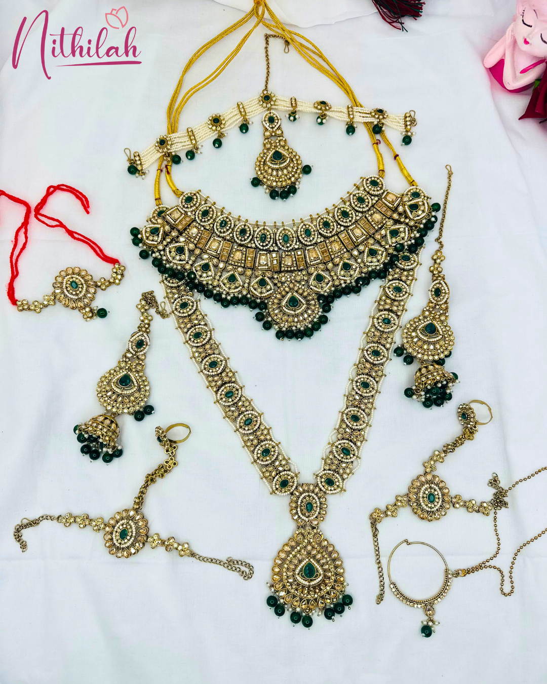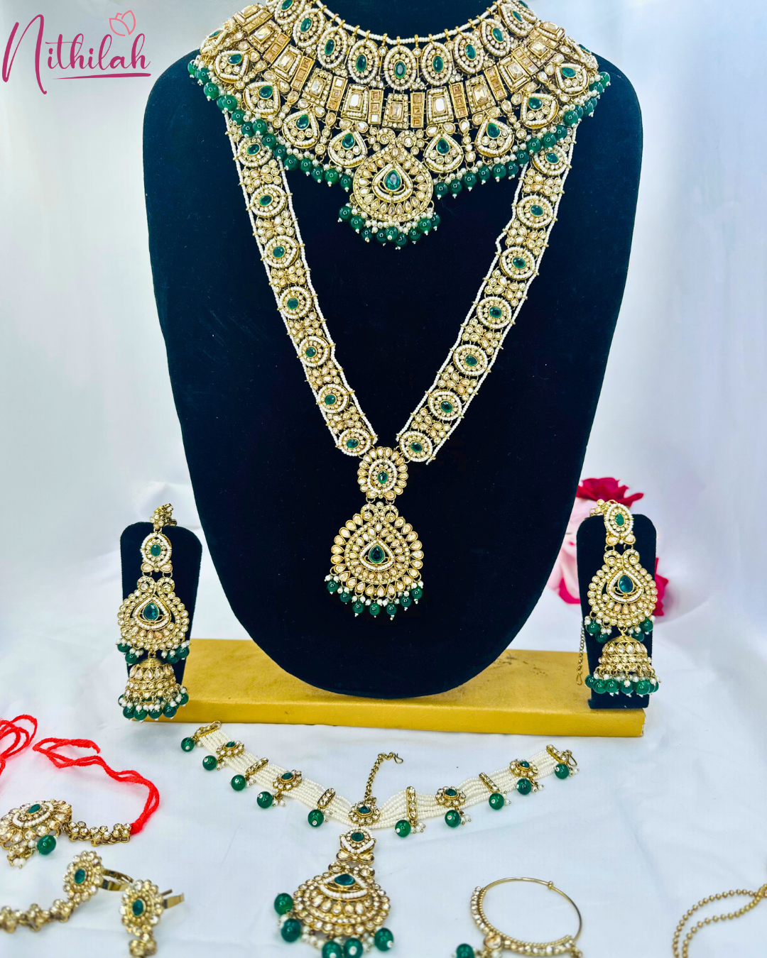 Details & Specifications: Material Used: Kundan pearl with Green beads Weight: Choker –195gms, Haaram- 144gms, Earring - 82gms, Maangtikka– 55gms, Finger ring - 48gms Vanki – 15gms, Nose ring - 10gms Length: Choker - 8*18Cms. Haaram – 36.5 cms, Earring– 14.5Cms, Maangtikka – 10.5cms, Vanki – 10cms, Finger Ring-12.5 Nose Ring -17 Fastening : Necklaces: All comes with attached adjustable thread Earring:Pushback with matil