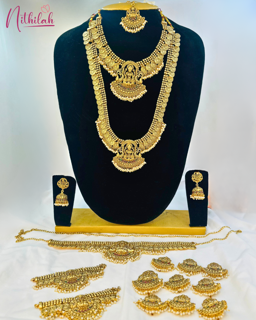 Details & Specifications:Material Used: Copper with brass and Pearls Weight: Haaram – 175gms, Necklace- 99gms,Earring –37gms, Maangtikka– 11gms, Hip belt – 119gms, Jade– 94 gms, Vanki – 89 gmsLength:Haaram - 28 Cms. Necklace – 15cms, Earring– 6 Cms, Maangtikka – 4cms, Hip Belt – 28cms, jade– 4.5to5.5 cms, Vanki – 11cms,Fastening : Necklaces: All comes with attached adjustable threadEarring:Pushback