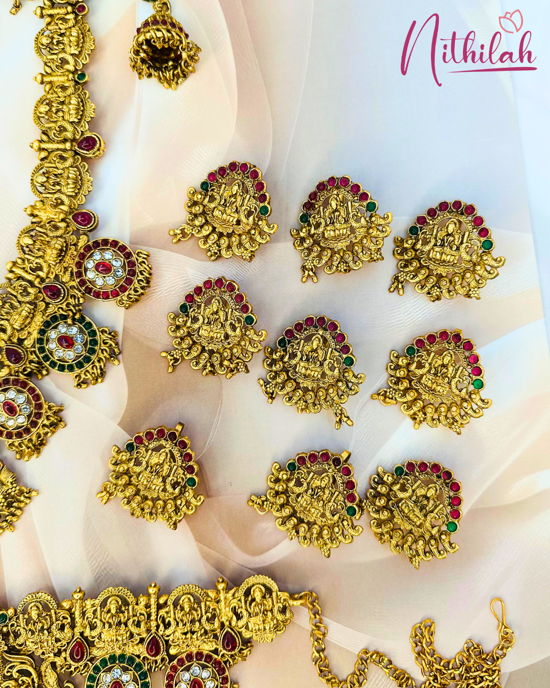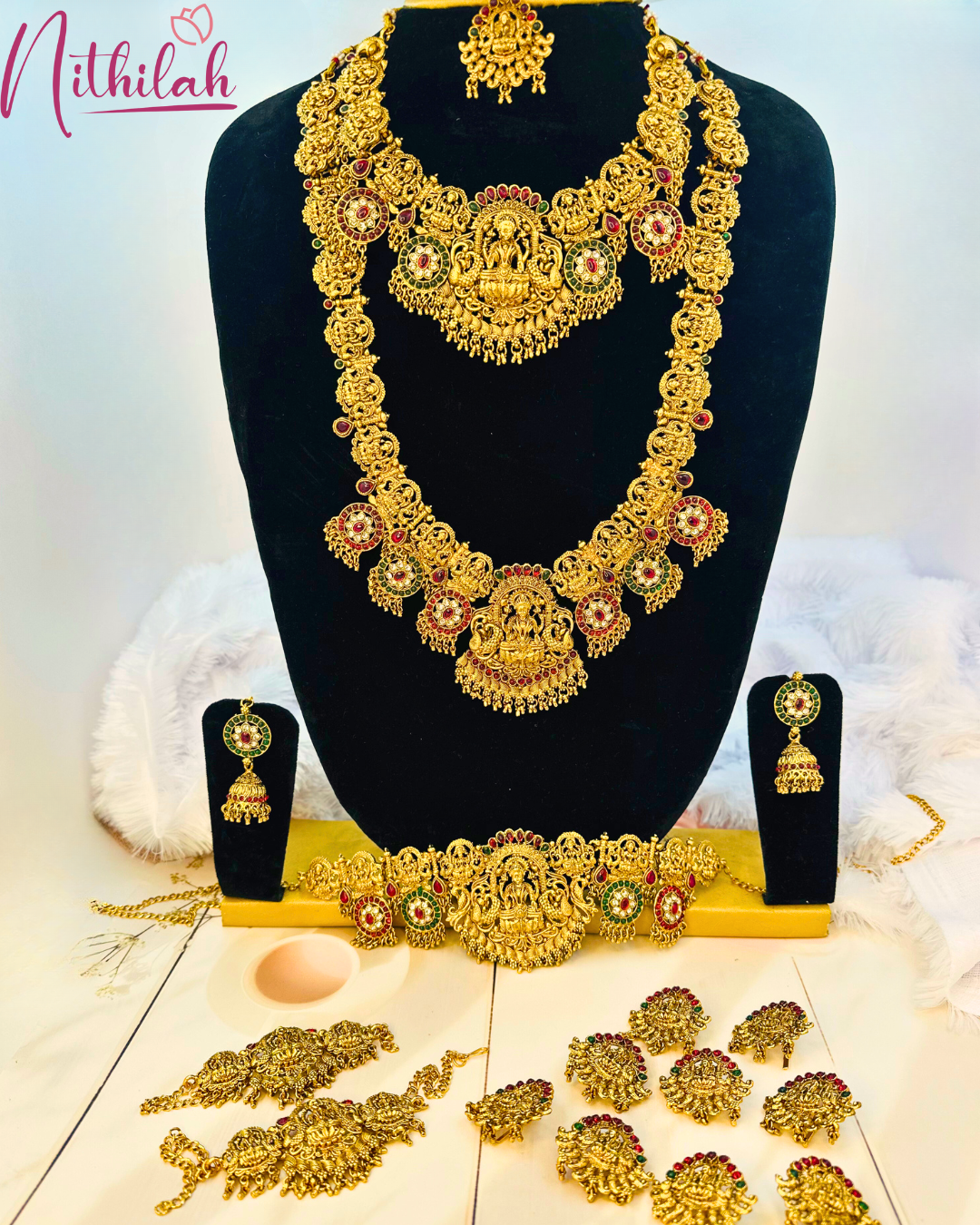 Details & Specifications:Material Used: Copper with brass with Gold toned Pearls Weight: Haaram –213gms, Necklace- 130gms,Earring - 36gms, Maangtikka– 13gms, Hip belt – 138gms, Jade– 95gms, Vanki – 65gmsLength:Haaram - 29Cms. Necklace – 13cms, Earring– 5.6Cms, Maangtikka – 4cms, Hip Belt – 23.5cms, Jade– 4 cms, Vanki – 8 cms,Fastening : Necklaces: All comes with attached adjustable threadEarring:Pushback with Matil