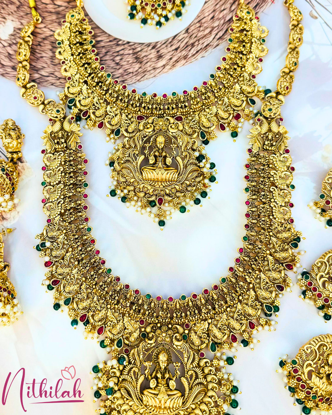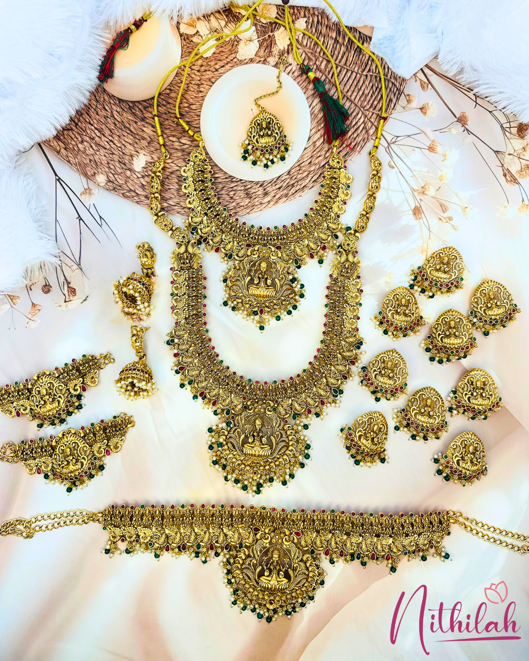 Details & Specifications:Material Used: Copper with brass And Pearls Weight: Haaram –188gms, Necklace- 122gms,Earring - 44 gms, Maangtikka– 20gms, Hip belt – 168 gms, Jade– 150gms, Vanki – 84gmsLength:Haaram - 28Cms. Necklace – 16cms, Earring– 6Cms, Maangtikka – 5cms, Hip Belt – 27.5cms, Jade– 5 cms, Vanki – 8 cms,Fastening : Necklaces: All comes with attached adjustable threadEarring:Pushback