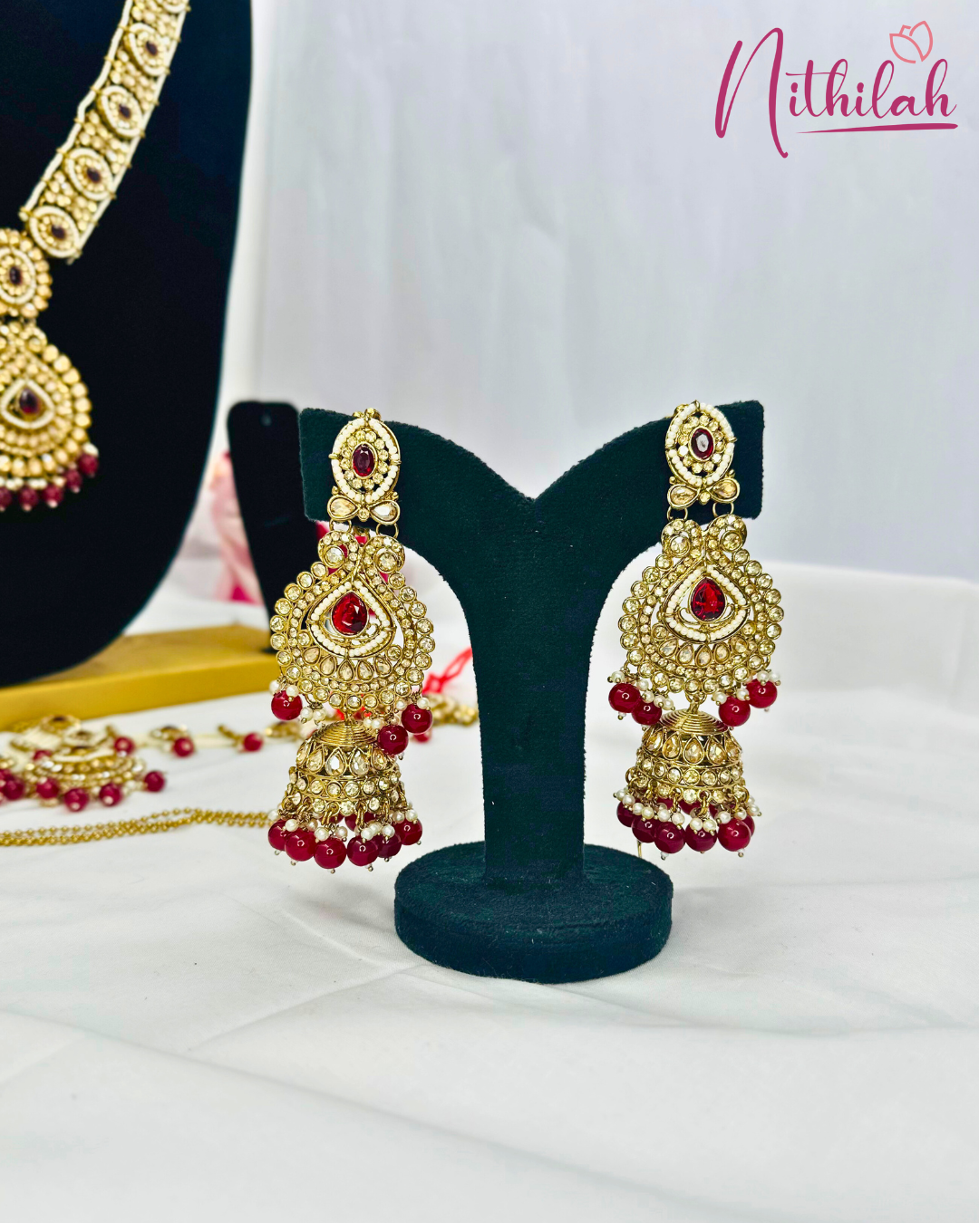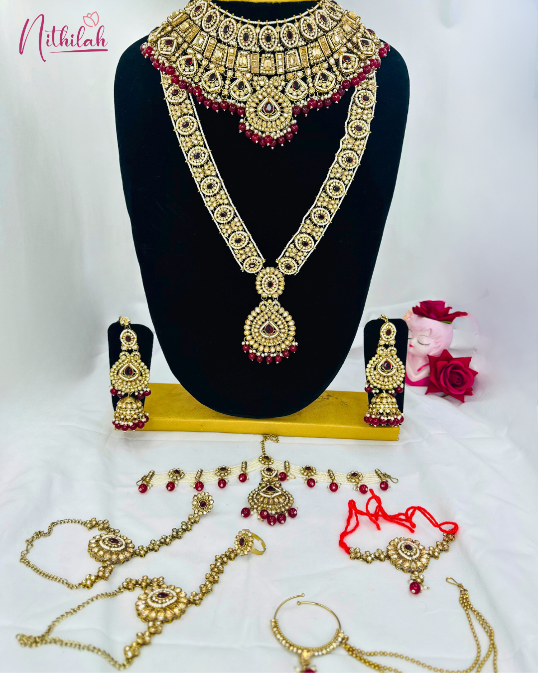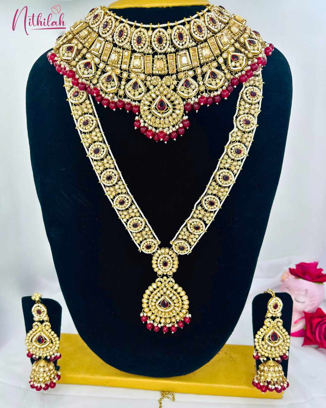 Details & Specifications: Material Used: Kundan pearl with Red beads Weight: Choker –195gms, Haaram- 144gms, Earring - 82gms, Maangtikka– 55gms, Finger ring - 48gms Vanki – 15gms, Nose ring - 10gms Length: Choker - 8*18Cms. Haaram – 36.5 cms, Earring– 14.5Cms, Maangtikka – 10.5cms, Vanki – 10cms, Finger Ring-12.5 Nose Ring -17 Fastening : Necklaces: All comes with attached adjustable thread Earring:Pushback with matil