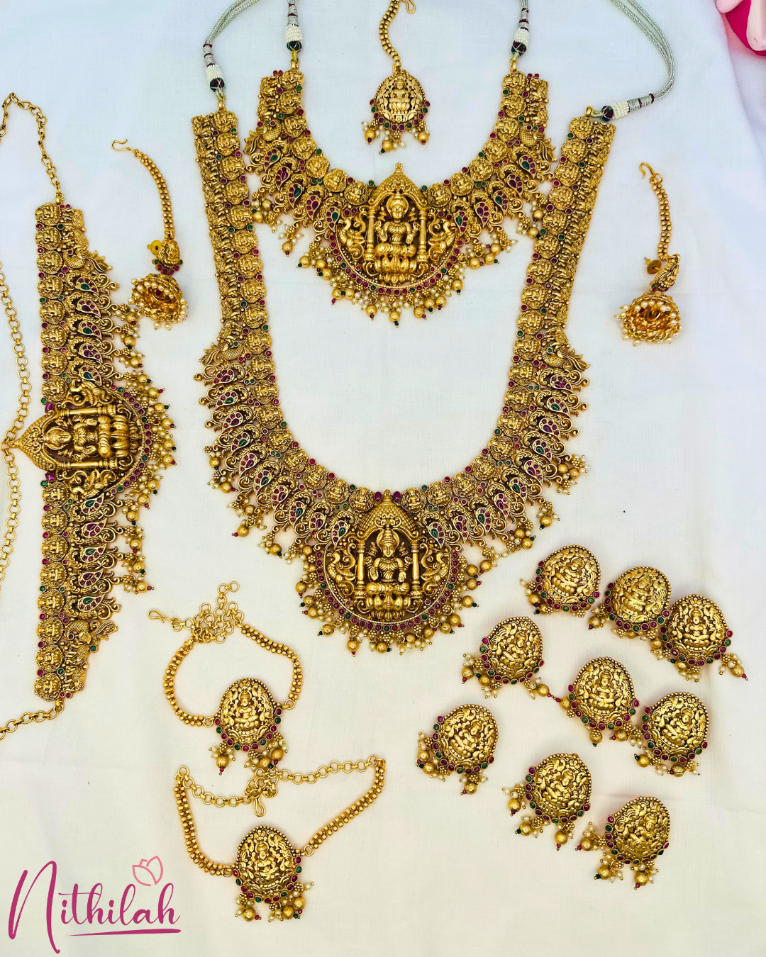 Details & Specifications:Material Used: Copper with brass And Gold toned Pearls DropsWeight:Haaram – 320 gms, Necklace- 200gms ,Earring – 37 gms, Maangtikka – 15 gms,Hip belt – 192 gms, Jade– 110 gms, Vanki – 44 gmsLength:Haaram -30 Cms. Necklace – 15 cms,Earring– 5.5 , Maangtikka – 5.5cms,Hip Belt – 25.5 cms, Jade– 5 cms, Vanki – 15 cms,Fastening : Necklaces: All comes with attached adjustable thread Earring:Pushback with Matil