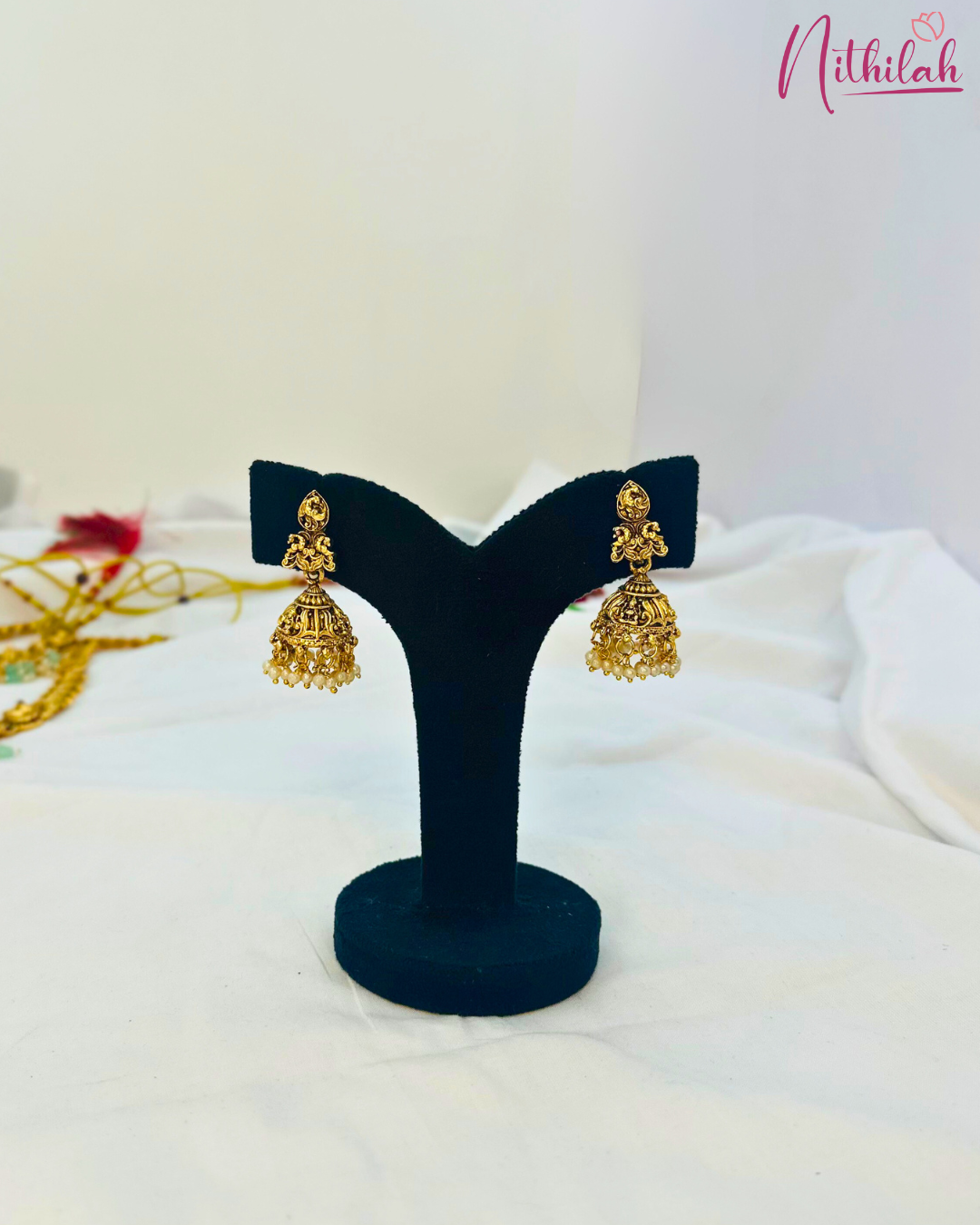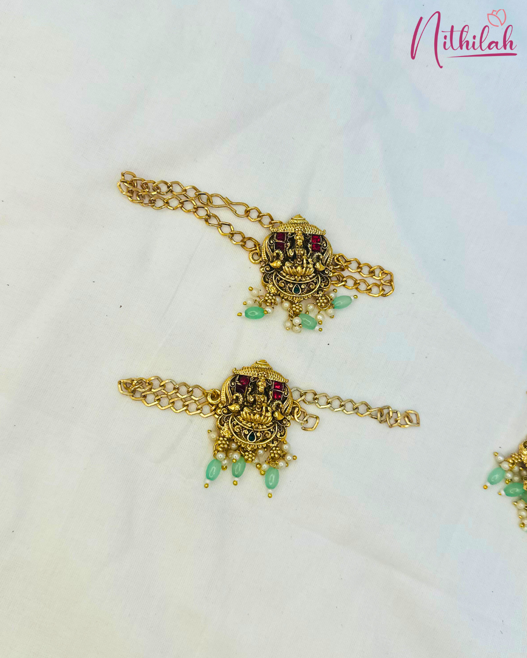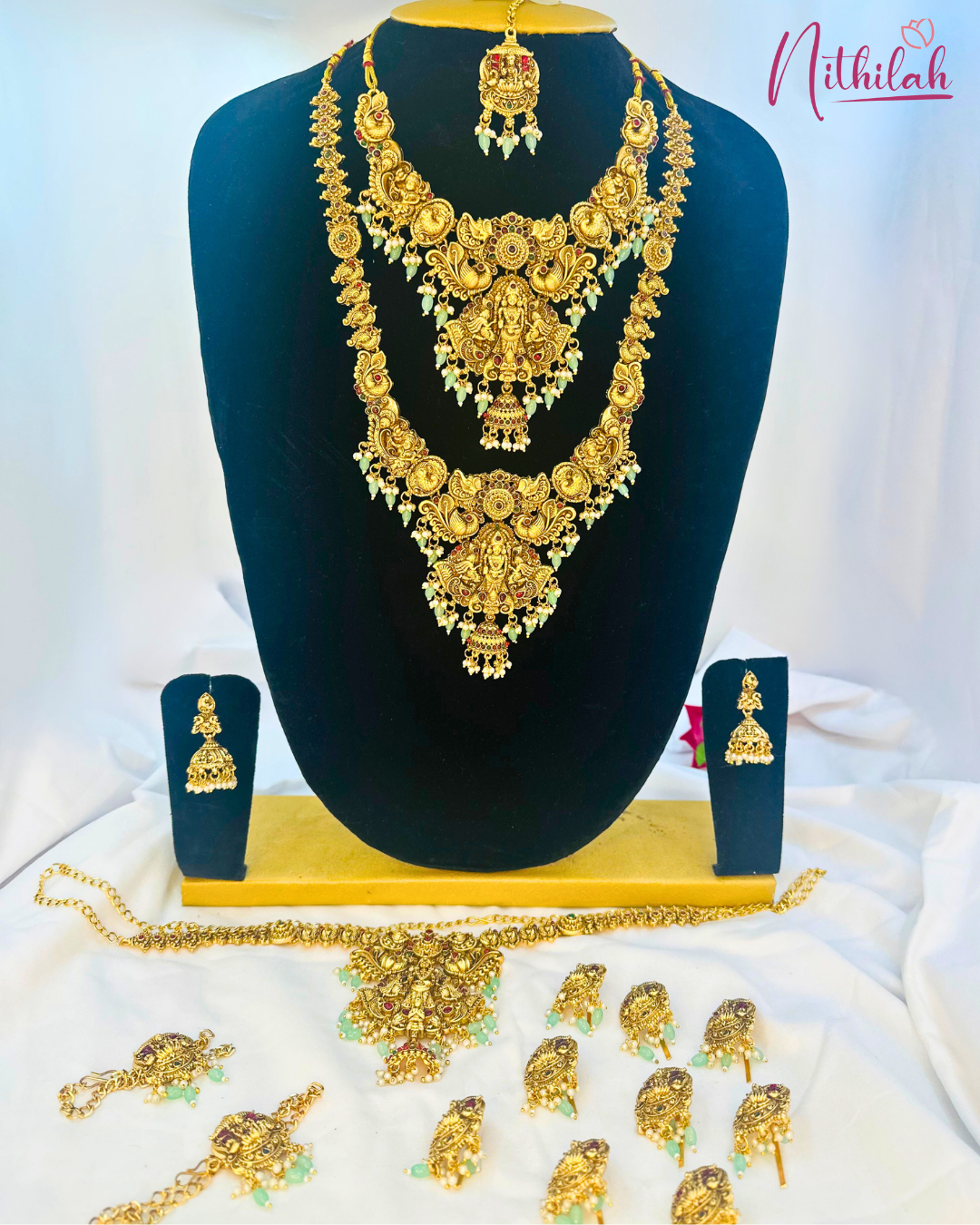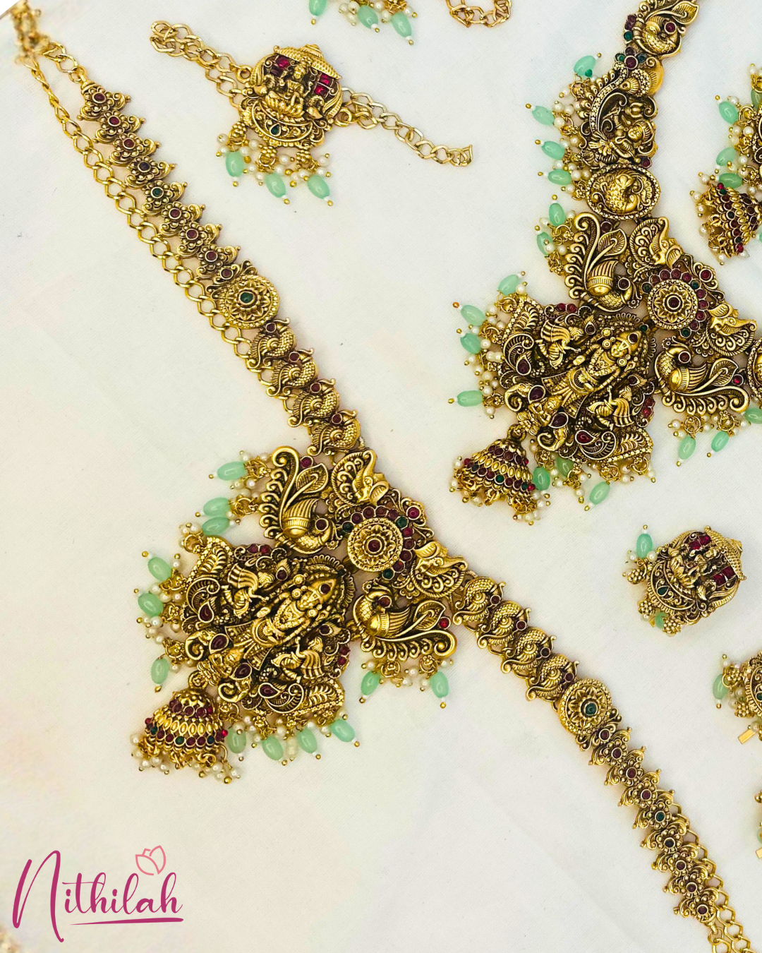 Details & Specifications:Material Used: Copper with brass with Pearls Mint BeadsWeight: Haaram –168gms, Necklace- 134gms,Earring - 24gms, Maangtikka– 15gms, Hip belt – 112gms, Jade – 127gms, Vanki – 49gmsLength:Haaram - 29Cms. Necklace – 16cms, Earring– 5Cms, Maangtikka – 5cms, Hip Belt – 28.5cms, Jade– 5cms, Vanki – 3cms,Fastening : Necklaces: All comes with attached adjustable threadEarring:Pushback
