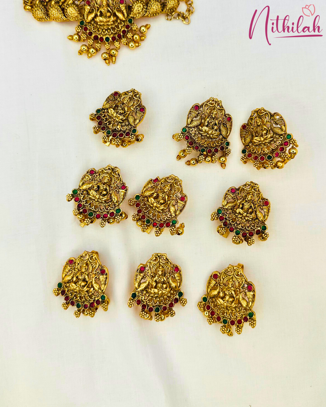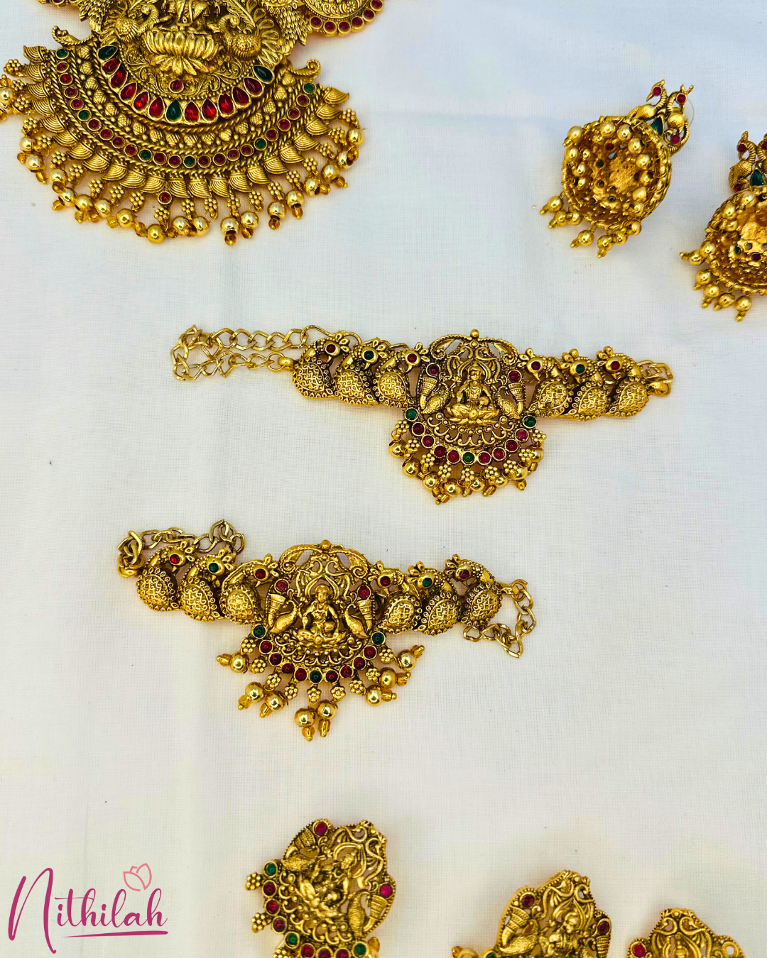 Details & Specifications:Material Used: Copper with brass with Pearls Weight: Haaram – 188gms, Necklace- 120gms,Earring –31gms, Maangtikka– 15gms, Hip belt – 139gms, Jade–95 gms, Vanki – 64 gmsLength:Haaram - 27 Cms. Necklace – 16.5cms,Earring– 5 Cms, Maangtikka – 5cms, Hip Belt – 28cms, Jade– 4.5cms, Vanki – 9cms,Fastening : Necklaces: All comes with attached adjustable threadEarring:Pushback
