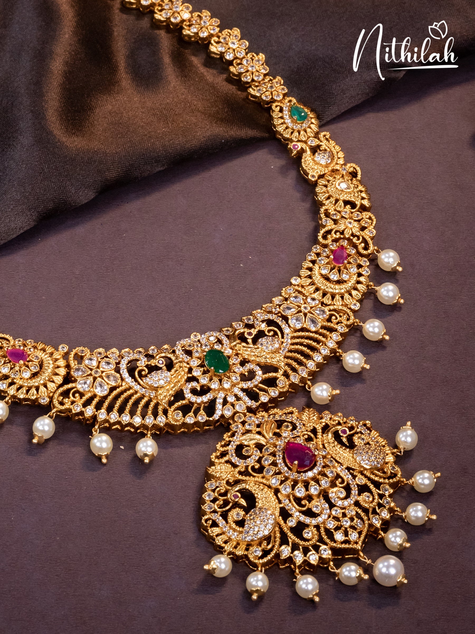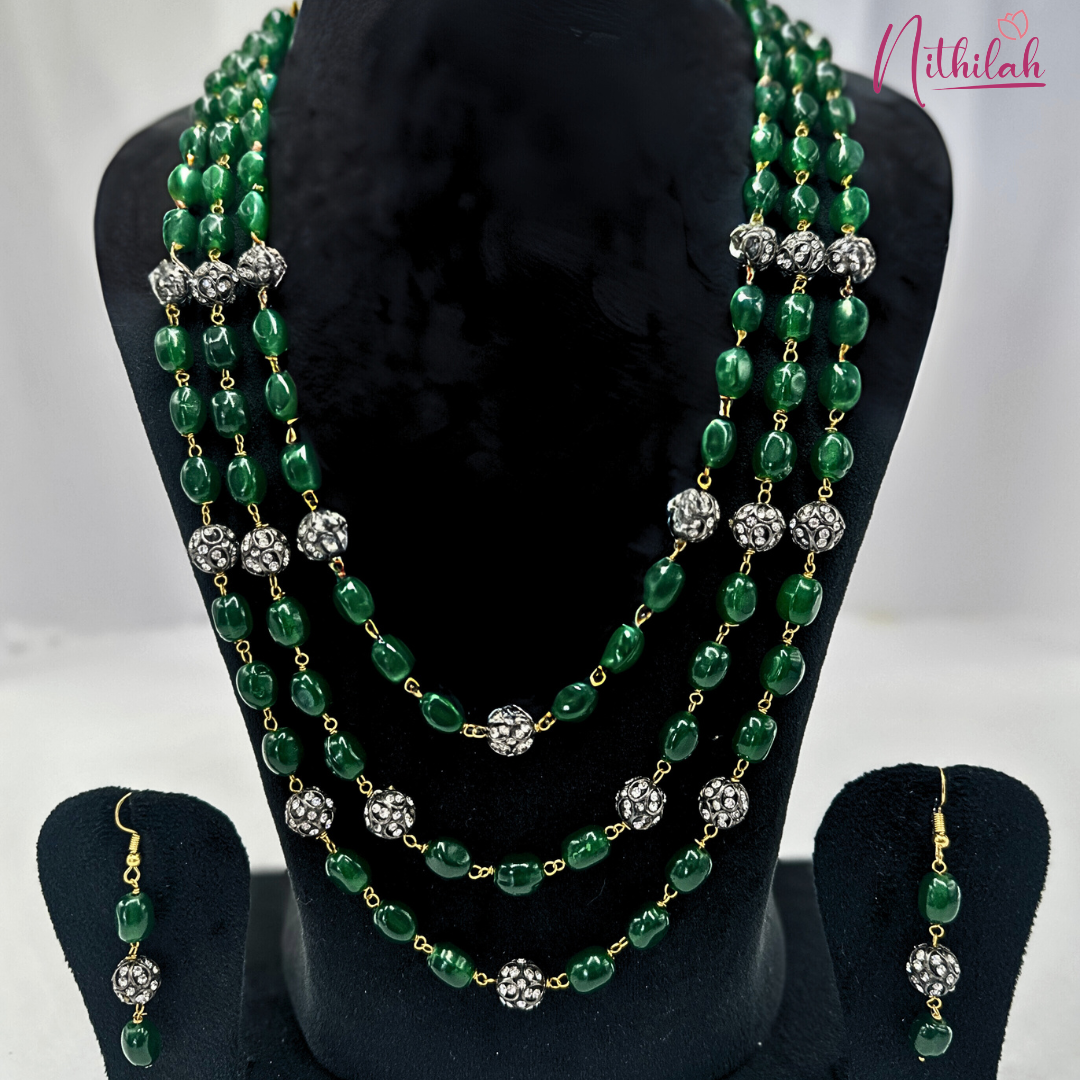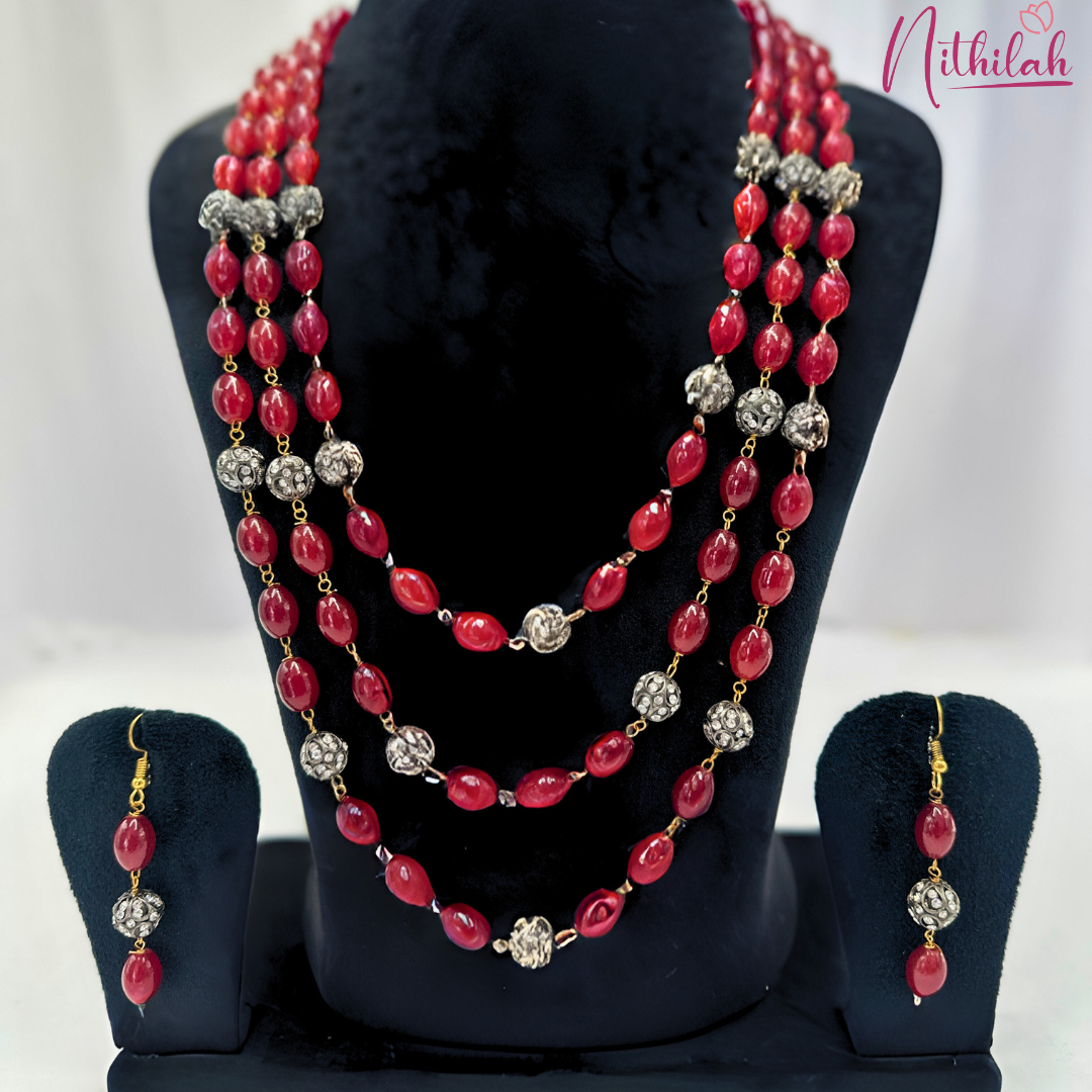 Long Harams also referred to as classical Indian Necklaces, which is a symbol of timeless beauty and cultural richness. Nithilah offers exquisite jewel pieces which is a perfect blend of tradition and style. Explore our unique collection priced less than 2500 featuring Barrel Beads, Oxidized Finish, Kundan Embellishments, Lakshmi Motifs, Antique Charm, and the popular Guttapusalu Design. The brilliant hues of barrel beads can enhance your ethnic attire after being donned with Long Harams. The cylindrical beads of barrel add a touch of delicacy and are a perfect choice for ladies who prefer refinement with grace.