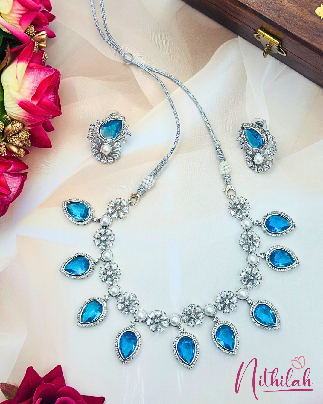 Silver Plated tear drop Blue AD Necklace