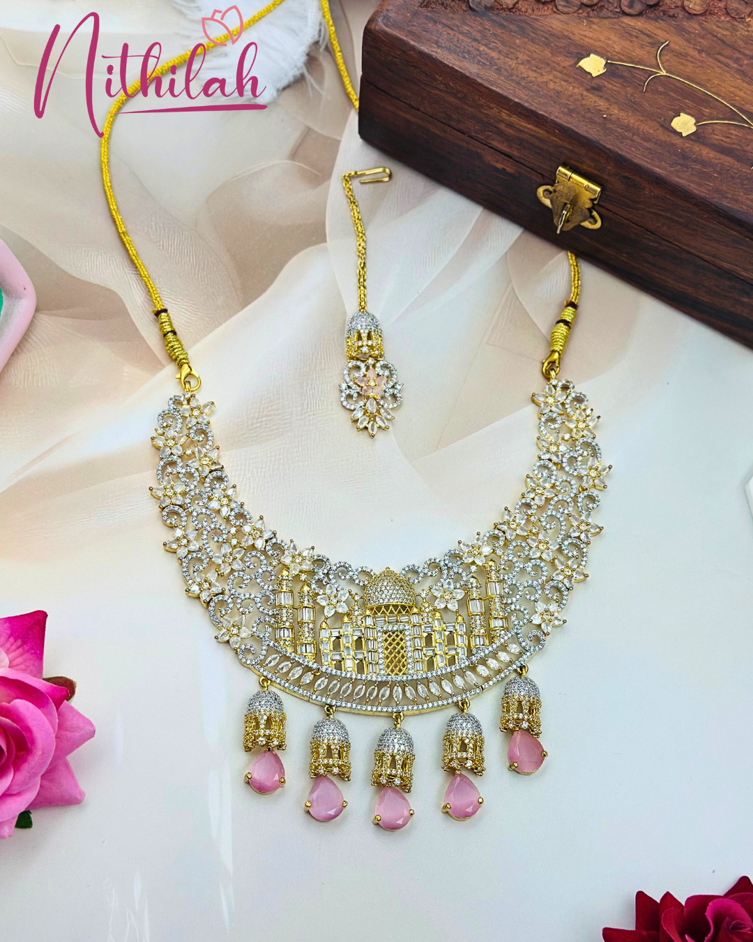 Taj Mahal Necklace set with Pink Monalisa AD